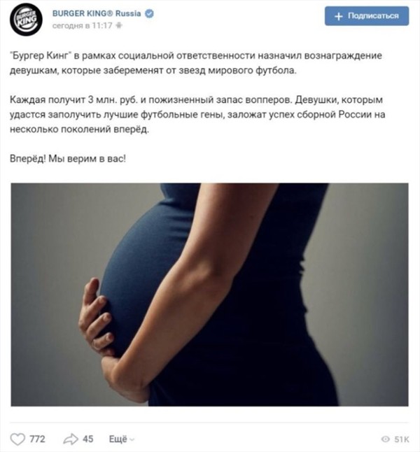 En redes sociales, la firma de comida rápida ofrecía 40 mil euros —cerca de 30 millones de pesos— y hamburguesas de por vida a mujeres que se embarazaran de jugadores extranjeros de alto nivel, para "obtener mejores genes para el fútbol".