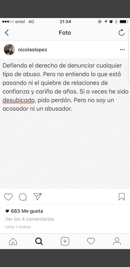Conocidas las denuncias en su contra, Nicolás López rompió el silencio y en su cuenta de Instagram negó ser "un acosador ni un abusador".
