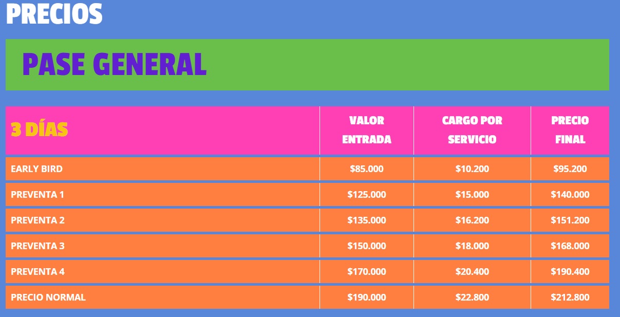 Los tickets comenzarán a venderse a partir del 30 de julio en modalidad en verde (Early Bird), y en dicha etapa tendrán un valor de $95.200, cargo por servicio incluido. En preventa 1 tendrán un valor de $140.000, en preventa 2 de $151.200, en preventa 3 de $168.000 y en preventa 4 de $190.400. El precio normal para las tres jornadas será de $212.800.