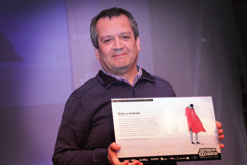 El primer lugar fue para el cuento Dolor o Molestia, de César Rodríguez (54), un emotivo relato que logró cautivar al jurado de la presente versión, compuesto por los escritores Roberto Merino (Todo Santiago, Crónicas de la ciudad, Padres e hijos), María José Ferrada (Kramp, La tristeza de las cosas) y Cristián Warnken (Un hombre extraviado, Las palabras del chamán en el fin del mundo).
