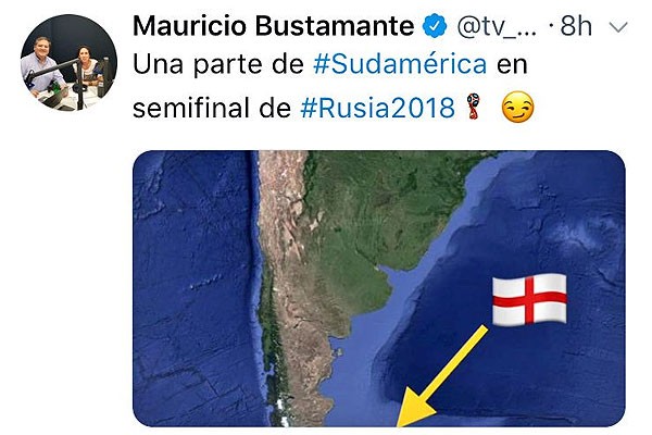 Tras la eliminación de Brasil y Uruguay del Mundial de Rusia 2018, el comunicador se refirió a la ausencia de países sudamericanos en el torneo futbolístico: "Una parte de #Sudamérica en semifinal de #Rusia2018", escribió con un mapa del continente y una bandera de Inglaterra que apunta a la ubicación de las islas, que los británicos disputaron con Argentina.