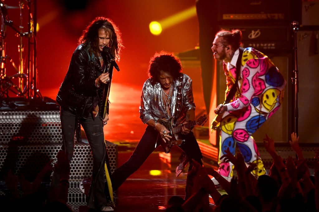 La presentación comenzó con el rapero de 23 años, quien interpretó su éxito “Rockstar” acompañado por Savage 21, antes de proceder a presentar a Aerosmith, colgarse una guitarra y cambiar completamente de registro a uno bastante más rockero.