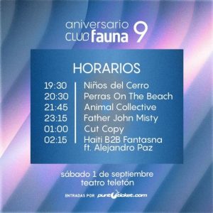 Noticias Revisa el horario del Aniversario Club Fauna 2018 Quedan un poco más de una semana para el Aniversario Club Fauna 2018, el espectáculo que contará con artistas nacionales e internacionales. Por Amalia Sepulveda | 22 Ago, 2018. 08:57 hrs Quedan un poco más de una semana para el Aniversario Club Fauna 2018, el espectáculo fijado para el 1 de septiembre en el Teatro Teletón que contará con artistas nacionales e internacionales. La producción dio a conocer los horarios de la presentación de cada artista: 19:30 Niños del Cerro 20:30 Perras on the Beach 21:45 Animal Collective 23:15 Father John Misty 01:00 Cut Copy 02:15 Haiti B2B Fantasna ft. Alejandro Paz Los precios de las entradas van desde los $32000 y están disponibles a través de Puntoticket Conciertos Director de Marvel quiere que la Avispa lidere película de Avengers 22 de agosto: ¡Feliz cumpleaños, Roland Orzabal! Sigue a Concierto.cl en Google Discover Recibe nuestros contenidos directamente en tu feed. Seguir en Google Contenido patrocinado