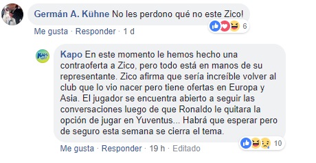 "En este momento le hemos hecho una contraoferta a Zico, pero todo está en manos de su representante. Zico afirma que sería increíble volver al club que lo vio nacer pero tiene ofertas en Europa y Asia. El jugador se encuentra abierto a seguir las conversaciones luego de que Ronaldo le quitara la opción de jugar en Yuventus... Habrá que esperar pero de seguro esta semana se cierra el tema", dijeron desde Kapo en un "comunicado de prensa", que sacó risas (y lágrimas) a los usuarios de Facebook.