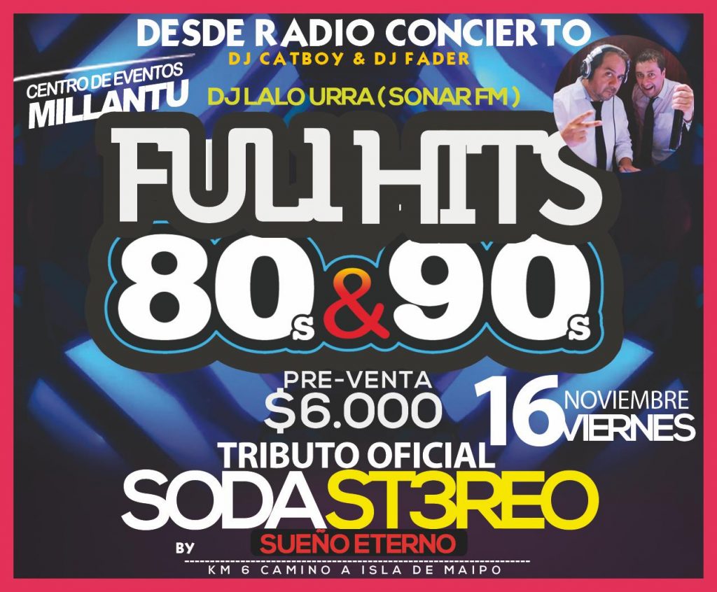 El viernes 16 de noviembre, en el Centro de Eventos Millantú, se realizará una nueva versión de la fiesta "Full Hits", con la mejor música de los ochenta y noventa a cargo de los DJs Fader, Catboy y Lalo Urra.
