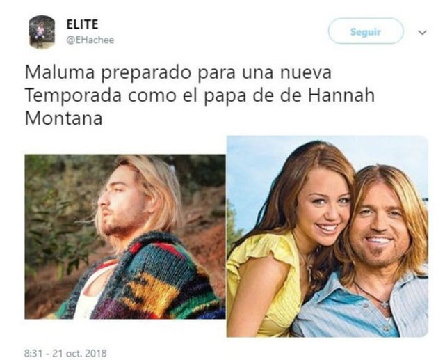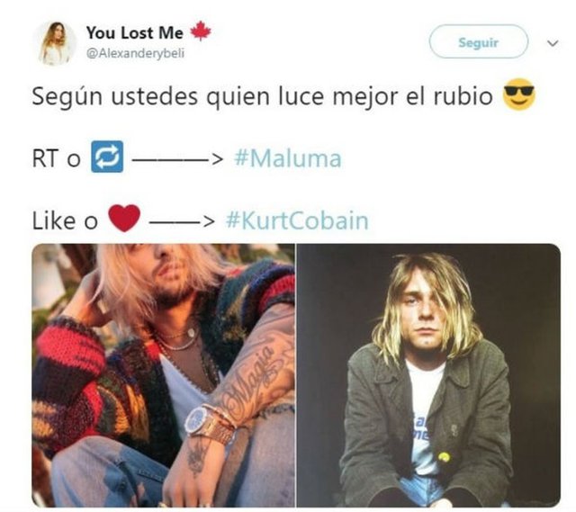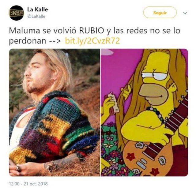 Noticias Maluma estrenó nuevo look y lo compararon con Kurt Cobain Maluma compartió fotografías en su cuenta de Instagram en las que aparece con el pelo rubio y largo, al clásico estilo de Kurt Cobain . Por alcayaga | 22 Oct, 2018. 17:43 hrs Los cambios de look de los famosos no son algo nuevo. Eso sí, algunos aciertan a la perfección pero otros no tienen la misma suerte y terminan siendo el centro de las burlas. El último de estos desafortunados cambios de estilo es el que se hizo Maluma. El colombiano compartió un par de fotografías en su cuenta de Instagram en las que aparece con el pelo rubio y largo, al clásico estilo de Kurt Cobain. Ver esta publicación en Instagram Una publicación compartida por MALUMA (@maluma) el 20 de Oct de 2018 a las 6:59 PDT Al parecer a sus fanáticos no les gustó el cambio y se lo hicieron saber a través de las redes sociales, donde el cantante se transformó en el centro de las burlas y generó una lluvia de memes. Fotos: Instagram Los Sin Anillo Tierra Sola: Rehenes en su propia casa Netflix anunció que (Des)encanto tendrá segunda temporada Sigue a Concierto.cl en Google Discover Recibe nuestros contenidos directamente en tu feed. Seguir en Google Contenido patrocinado