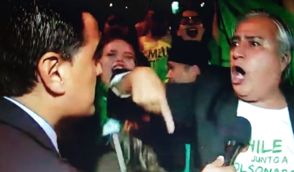 Durante la cobertura de Canal 13 al triunfo del político de extrema derecha, el periodista Ramón Ulloa se topó con un ciudadano chileno, autoproclamado "nacionalista", quien festejaba junto a simpatizantes del nueveo mandatario brasileño.