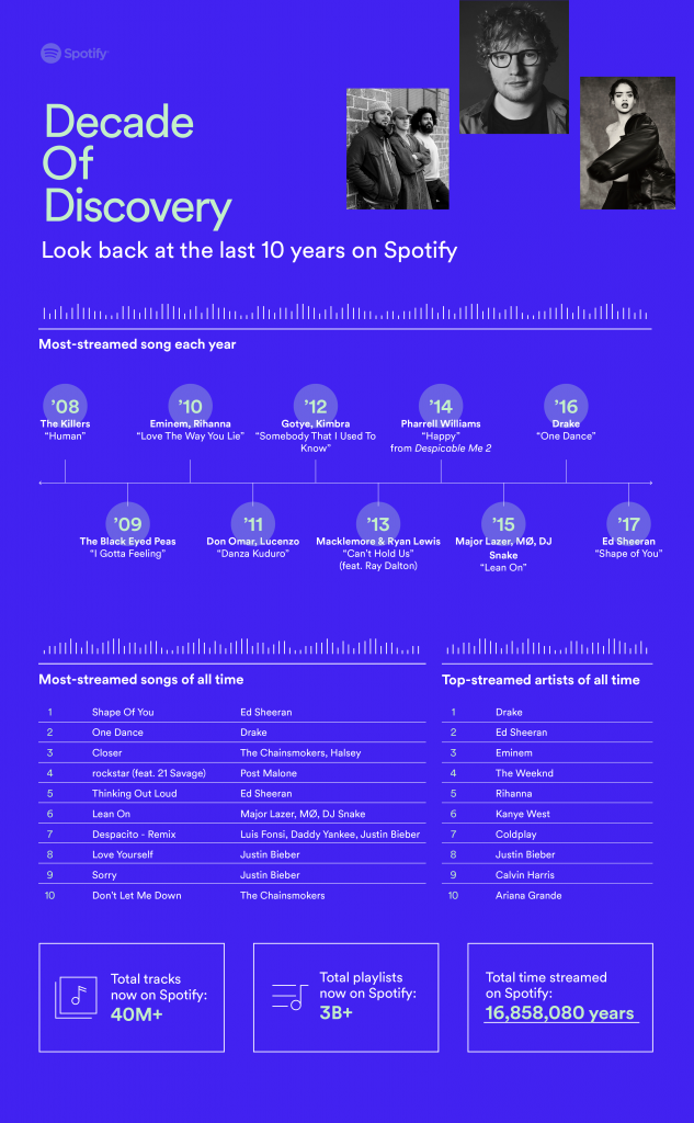 También se hizo un desglose de los temas más reproducidos por año, donde aparecen artistas como The Killers on "Human (2008), Gotye y Kimbra con "Somebody That I Used To Know" (2012), Major Lazer, MØ y DJ Snake con "Lean On" (2015) y la mencionada "Shape of You" de Sheeran (2017)