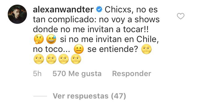 Noticias Alex Anwandter, el único chileno en Lollapalooza Argentina 2019 En redes sociales, el ex Teleradio Donoso explicó por qué no tocará en la versión local del evento, donde se presentó este año. Por javier valladares | 21 Nov, 2018. 17:23 hrs Alex Anwandter es el único chileno que tocará en la versión argentina de Lollapalooza, cuyo cartel, al igual que el chileno, fue revelado esta jornada. El ex Teleradio Donoso será parte de la cita que se realizará los días 29, 30 y 31 de marzo en el Hipódromo de San Isidro. Eso sí, no dirá presente en la edición chilena del evento, en la que sí participó este año. Consultado por qué no estará en Lollapalooza Chile, en redes sociales el cantautor aclaró que no fue invitado por los organizadores. Ver esta publicación en Instagram Y una noticia flash: Argentina, nos vemos en marzo 🙋🏽♀️🌈🇦🇷💕 Una publicación compartida de @ alexanwandter el 21 Nov, 2018 a las 7:20 PST Anwandter tocará este jueves en el Teatro Caupolicán, donde presentará en sociedad las canciones de su nuevo disco de estudio Latinoamericana. Entradas disponibles en Ticketek. Conciertos Puro humo: loro imitador de alarma movilizó a bomberos Miembros de New Order se refieren a cancelación del show: Evalúan reagendar Sigue a Concierto.cl en Google Discover Recibe nuestros contenidos directamente en tu feed. Seguir en Google Contenido patrocinado