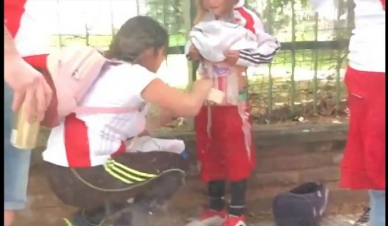 En la previa de lo que debió ser la final entre River Plate y Boca Juniors por la Libertadores el sábado pasado, una mujer fue captada envolviendo bengalas en el cuerpo de su hija.