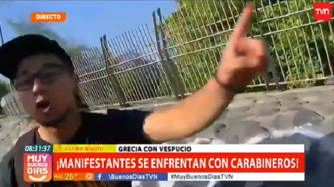 Daniela Muñoz del matinal Muy Buenos Días, se encontraba informando sobre los desmanes en el lugar y señaló que dos encapuchados habían lanzado piedras a los peatones y, posteriormente, fueron detenidos por Carabineros.
