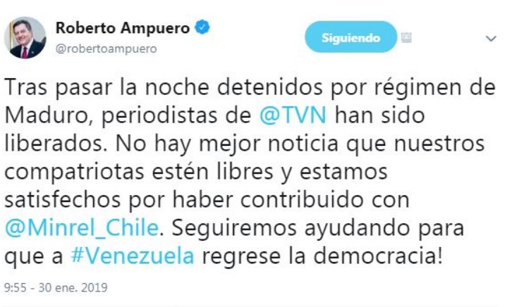 Noticias Canciller Ampuero borró tuit sobre liberación de periodistas detenidos en Venezuela El ministro de Relaciones Exteriores debió rectificarse tras anunciar que los corresponsales habían sido liberados, algo que aún no ocurre. Por javier valladares | 30 Ene, 2019. 13:02 hrs Numerosas críticas ha recibido el Canciller Roberto Ampuero, quien comunicó por error la liberación de los reporteros de TVN detenidos en Venezuela. En horas de esta mañana, el titular de Relaciones Exteriores informó que "no hay mejor noticia que nuestros compatriotas estén libres", aunque ni el periodista Rodrigo Pérez ni el camarógrafo Gonzalo Barahona siguen aprehendidos. Por ello, debió hacer un mea culpa y precisar que los reporteros no han sido liberados. "Seguimos trabajando por obtener la libertad de nuestros compatriotas de TVN detenidos en Venezuela", escribió. Lamento comunicar: me precisan que sólo fueron liberados los venezolanos detenidos que acompañaban a los periodistas chilenos. Seguimos trabajando por obtener la libertad de nuestros compatriotas de TVN detenidos en Venezuela. — Roberto Ampuero (@robertoampuero) 30 de enero de 2019 Actualidad Bad Boys 3: Primer vistazo a la película Defensa de Harvey Weinstein desestimó demanda colectiva por tráfico sexual Sigue a Concierto.cl en Google Discover Recibe nuestros contenidos directamente en tu feed. Seguir en Google Contenido patrocinado