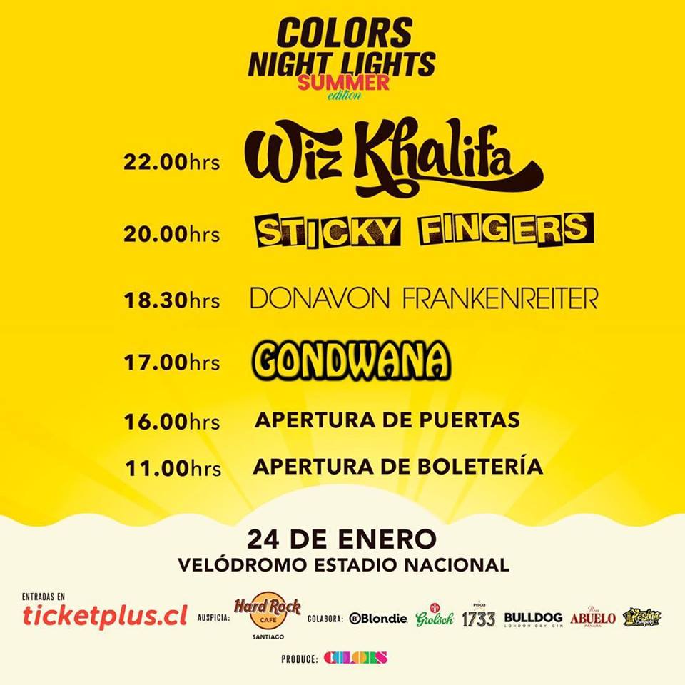 La apertura de puertas será a las 16 horas, y a las 17 se presentará Gondwana. A las 18.30 será el turno de Donavon Frankenreiter, a las 20 horas tocará Sticky Fingers y a las 22 hará lo propio Wiz Khalifa.