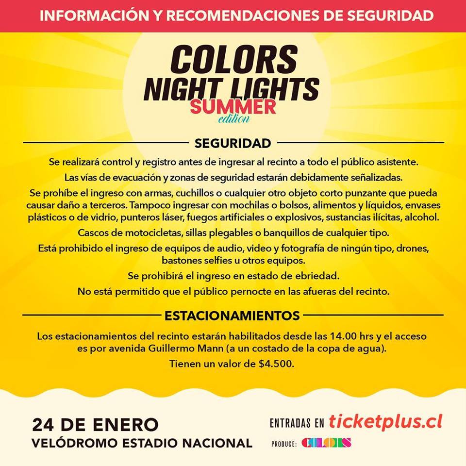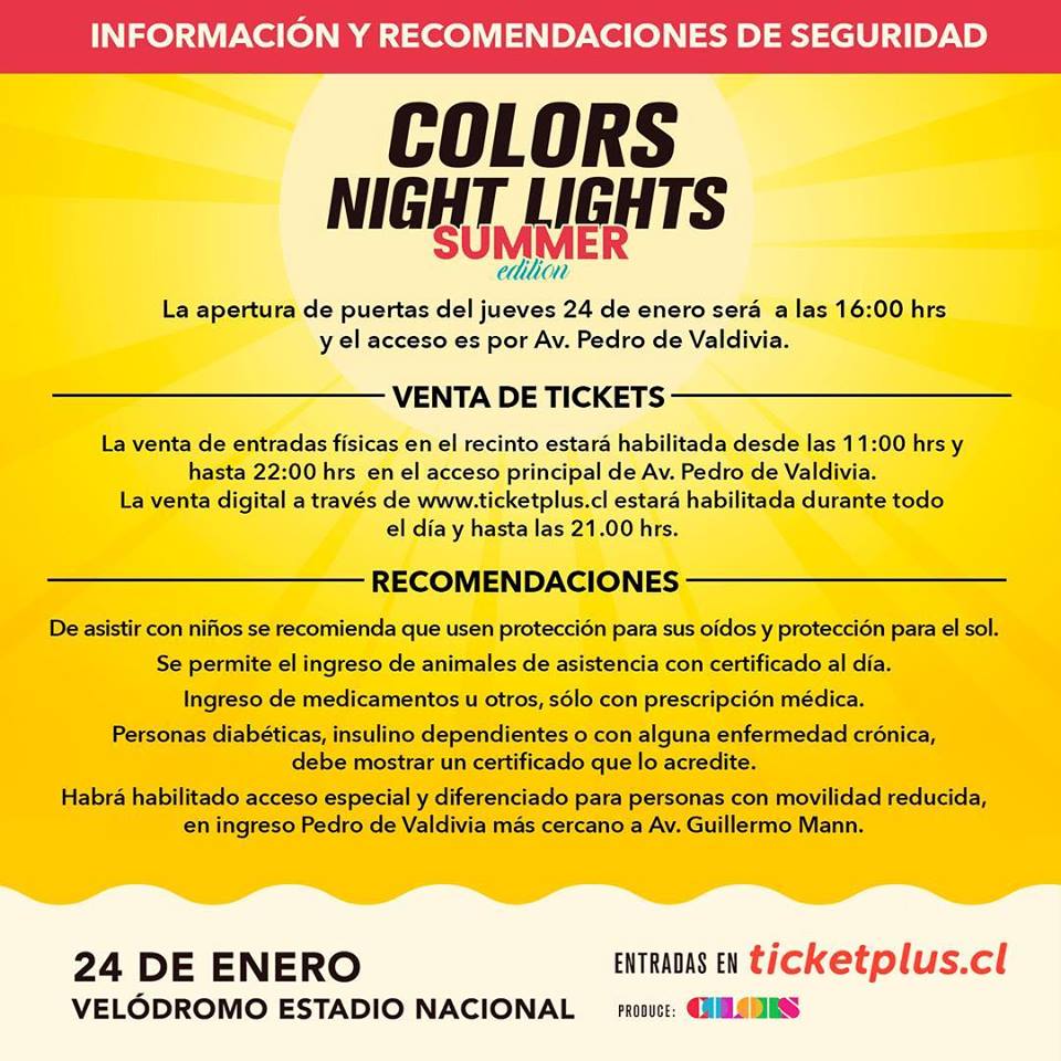 Este jueves se realizará la edición veraniega del festival Colors Night Lights, en el Velódromo del Estadio Nacional.