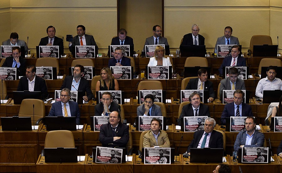 Este jueves, la bancada de la UDI levantó una serie de carteles contra Gabriel Boric, tras la polémica de su polera donde aparece Jaime Guzmán baleado.