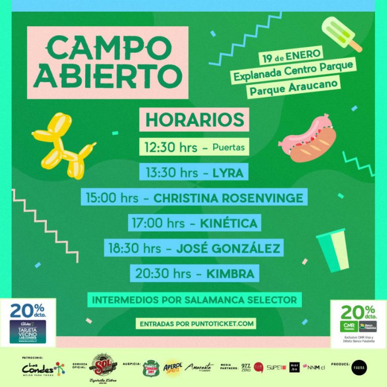 Agenda Concierto Festival Campo Abierto en Parque Araucano de Las Condes Por Arak Herrera | 18 Ene, 2019. 12:52 hrs Mañana se realizará la nueva edición del festival Campo Abierto, en el Parque Araucano de Las Condes. El evento tendrá música en vivo, gastronomía, zonas para niños y clases de cocina. La española Christina Rosenvinge, José González y Kimbra, entre otros, animarán la cita, que arrancará pasado el mediodía. Entradas disponibles en Puntoticket. Agenda Concierto Pillanes, Pedropiedra, Los Bunkers y Chancho en Piedra en Club Chocolate Fiesta Club 80 en Espacio Sporting de Viña del Mar Sigue a Concierto.cl en Google Discover Recibe nuestros contenidos directamente en tu feed. Seguir en Google Contenido patrocinado