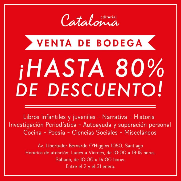 Agenda Concierto Venta de bodega de Editorial Catalonia Podrás encontrar hasta un 80% de descuento en cientos de libros. Por Arak Herrera | 25 Ene, 2019. 12:12 hrs Este fin de semana, Editorial Catalonia tiene una venta de bodega con hasta 80% de descuento en cientos de libros, entre ellos, textos especializados de trabajo social y educación. Hoy viernes funciona entre 10.00 y 19.15 horas. Mañana sábado, desde las 10 de la mañana hasta las 2 de la tarde. La dirección es Alameda 1050. Tenemos hasta 80% de descuento en nuestra venta de bodega. Sellos Catalonia, Gredos, Biblos, Losada, Libros La Araucaria, Argonauta y mucho más 😱😱 pic.twitter.com/DOgYWwQcEi — Editorial Catalonia (@Catalonialibros) 17 de enero de 2019 Agenda Concierto "Demasiado cortas las piernas" en el Festival Internacional de Artes Escénicas Santiago Netflix prepara una serie de Resident Evil Sigue a Concierto.cl en Google Discover Recibe nuestros contenidos directamente en tu feed. Seguir en Google Contenido patrocinado