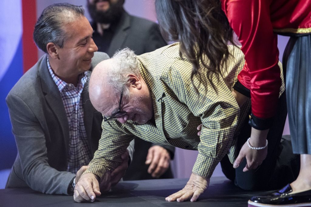 Cuando subía al escenario, DeVito se tropezó en uno de los escalones y cayó de bruces, aunque alcanzó a proteger su rostro con las manos.