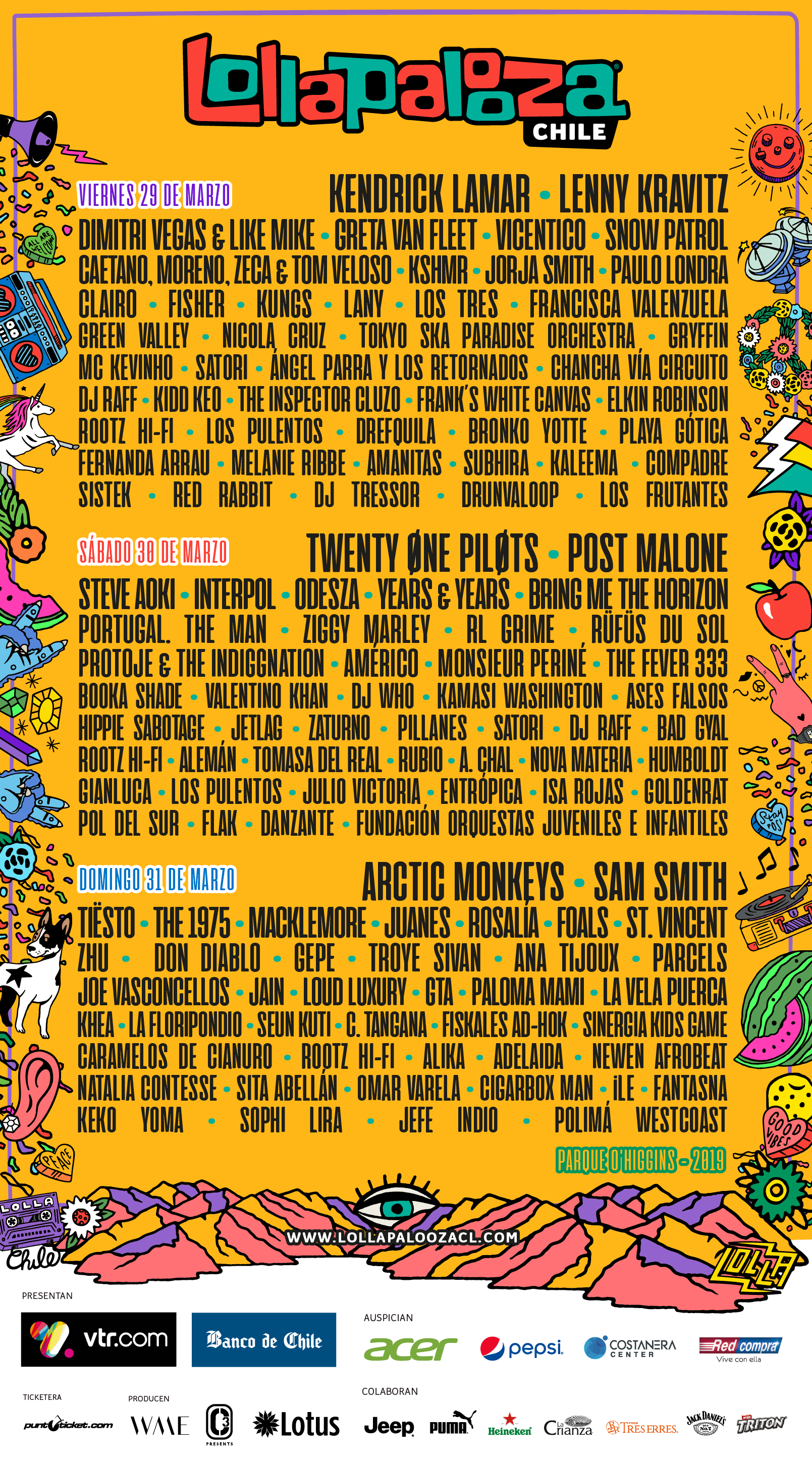Artistas como Lenny Kravitz, Sam Smith, Arctic Monkeys, St. Vincent y Foals serán parte de la parrilla de la cita, que como hace cinco años será transmitida por televisión y también por streaming, para quienes no puedan asistir al Parque O'Higgins.