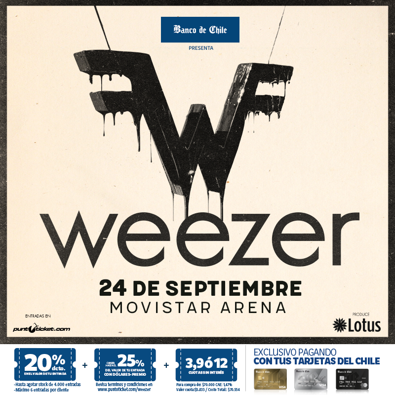 Una de las bandas más esperadas por el público chileno tendrá por fin su debut en los escenarios locales: Weezer, responsables de clásicos como "Buddy Holly", "Hash Pipe" y "Island in the Sun", confirmó su primera presentación en el país.