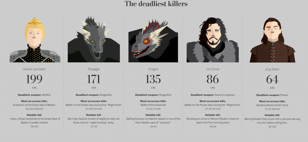 Si bien el recopilatorio cuenta con datos de la temporada 1 a la 7, desmenuza los numerosos decesos de Game of Thrones con diferentes factores: quiénes han sido los responsables de más muertes, cuáles son los lugares más fatales y qué casas han sufrido mayores bajas, entre otros datos. Además, se detalla cómo han ido perdiendo la vida los personajes principales.