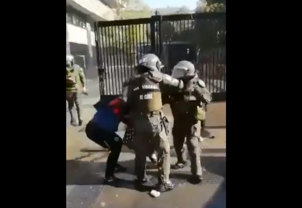 En detenciones del día de hoy en el Instituto Nacional, funcionaria de carabineros golpea en el rostro a reportera gráfica, en la imagen se muestra que en su puño tiene granada de gas lacrimógeno.