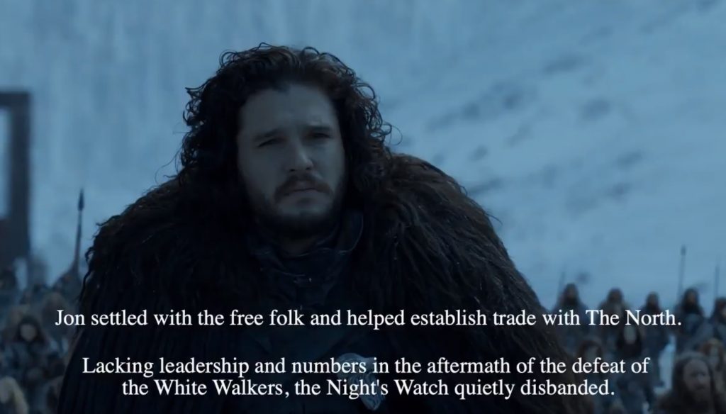 Así, Jon Snow se estableció con el pueblo libre y tuvo nexos amistosos con el Norte, mientras que la reina Sansa debió hacer frente a una dura hambruna por los efectos del invierno.