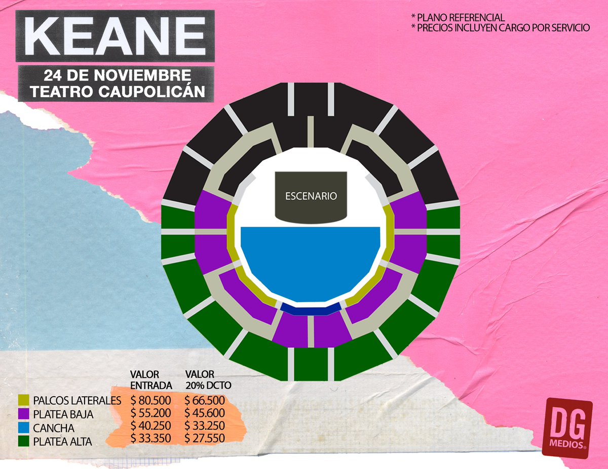 Las entradas para el retorno de Keane a Chile estarán en preventa a partir de este miércoles en Puntoticket para clientes de Entel, quienes tendrán una rebaja de 20% en su boleto. La venta general comenzará el viernes 14 a las 11 horas.