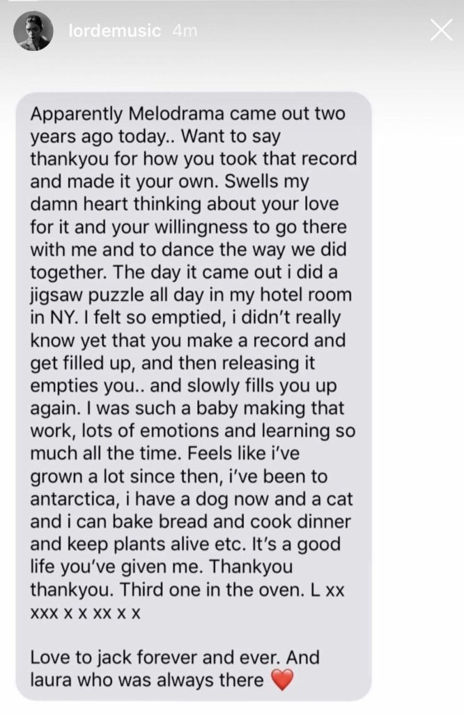 En su cuenta de Instagram, la cantante y compositora neozelandesa festejó los dos años de su segunda placa, agradeció el apoyo de sus fans y reflexionó sobre su vida.