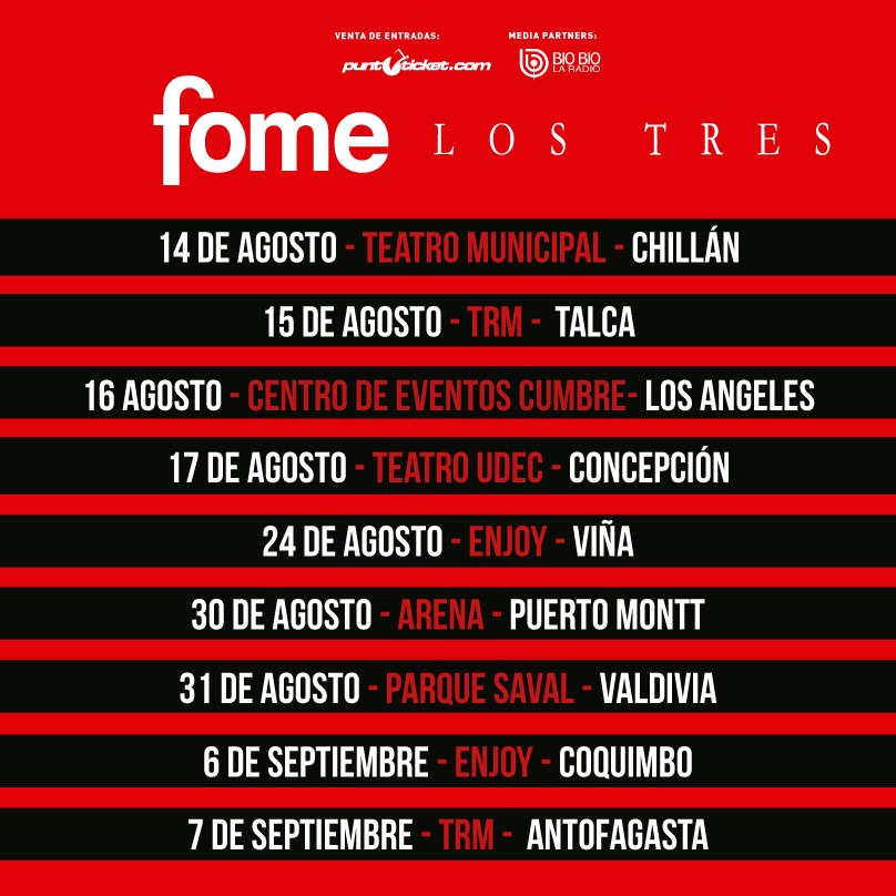 Los Tres anunciaron gira nacional para festejar su disco Fome. Luego de repletar en dos oportunidades el Teatro Coliseo de Santiago, el conjunto extenderá los festejos al resto del país.