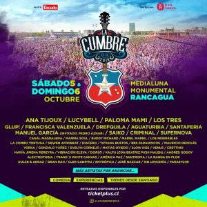 Agenda Concierto La Cumbre 2019 en Medialuna Monumental de Rancagua Mañana sábado 5 y el domingo 6 de octubre, se celebrará La Cumbre 2019 de la música nacional en la Medialuna Monumental de Rancagua. Por Amalia Sepulveda | 04 Oct, 2019. 11:51 hrs Mañana sábado 5 y el domingo 6 de octubre, se celebrará La Cumbre 2019 de la música nacional en la Medialuna Monumental de Rancagua. Los números principales son Los Tres, Francisca Valenzuela, Paloma Mami, Saiko, Lucybell, los reunidos Glup, De Saloon, Ana Tijoux y Manuel García. Entradas en Ticketplus.cl y Mall Plaza América de la capital regional. Agenda Concierto “Zurita, verás no ver” de Alejandra Carmona 8va Primavera del Libro de Providencia Sigue a Concierto.cl en Google Discover Recibe nuestros contenidos directamente en tu feed. Seguir en Google Contenido patrocinado