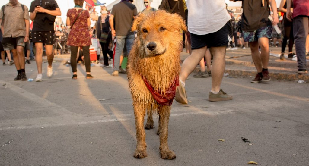Sin embargo, no todo ha sido bueno para el perrito, dado que el fin de semana recién pasado resultó herido luego de que Carabineros lo impactara directamente con el potente chorro del carro lanza-agua.