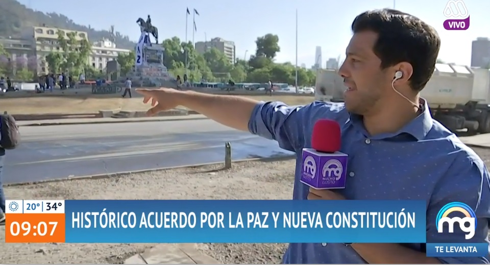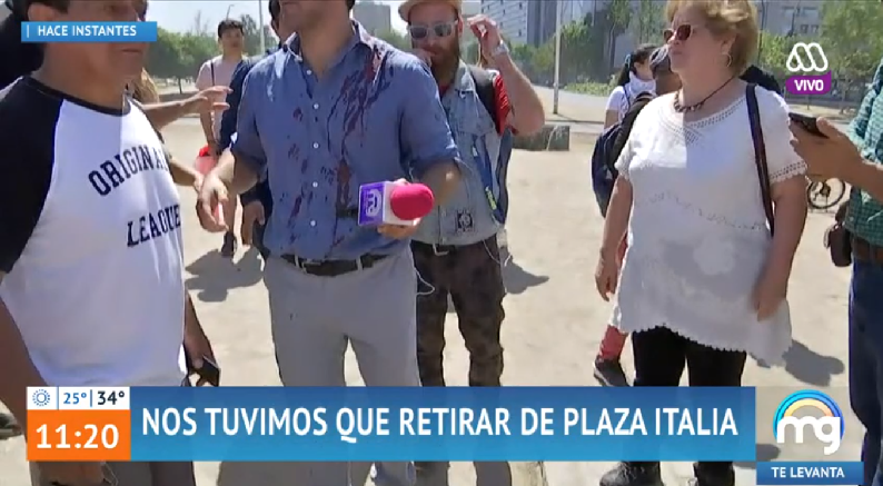 Noticias Lanzan pintura a periodista de "Mucho Gusto" en despacho en vivo El hecho ocurrió cuando el popular periodista del reconocido matinal de Mega, Mucho Gusto, transmitía un despacho desde Plaza Italia. Por Equipo Concierto.cl | 16 Nov, 2019. 18:44 hrs El popular periodista de "Mucho Gusto", Simón Oliveros, tuvo un incómodo momento este viernes mientras realizaba un despacho en vivo desde Plaza Italia. En específico, el reportero se encontraba entrevistando a la gente para conocer su opinión respecto a una nueva Constitución. Fue allí que un desconocido le lanzó pintura. La transmisión se cortó y el comunicador explicó la situación: “No vayan a pensar otra cosa, pero es pintura no más. Fue alguien que claramente no nos estaba escuchando", afirmó el notero. Lee también: Periodista de matinal sale corriendo al ser atacado con piedras En pantalla Robert Downey Jr. volverá a ser Iron Man en nueva serie de Marvel Trolean a ilustrador que creó el "Rubio Matacapuchas" Sigue a Concierto.cl en Google Discover Recibe nuestros contenidos directamente en tu feed. Seguir en Google Contenido patrocinado