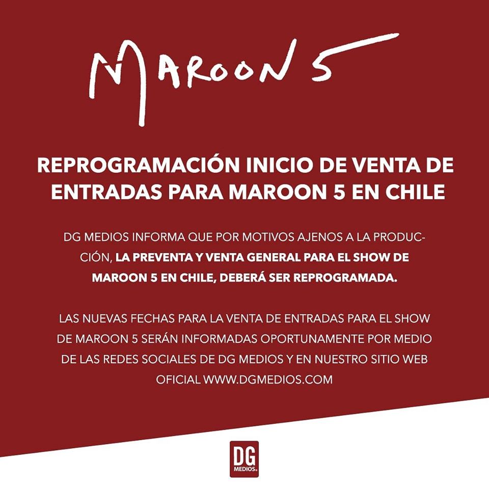Noticias Reprograman inicio de venta de entradas para Maroon 5 en Chile La productora de Maroon 5 en Chile indicó que se debe a "motivos ajenos a la producción". Revisa más detalles en Concierto.cl Por Iván Rimassa | 25 Nov, 2019. 10:58 hrs DG Medios, la productora encargada de la visita de Maroon 5 a Chile, anunció hoy que la venta de entradas para Maroon 5 no empezará en la fecha que originalmente se había pactado. Desde la compañía indicaron que esto es "por motivos ajenos a la producción", y que las nuevas fechas para poder comprar tickets al show de Maroon 5 "serán informadas oportunamente" por sus redes y sitio web. Lee también: Gobierno a Mon Laferte por acusar a Carabineros y FFAA de quemar Metro, "Es una calumnia". Revisa el comunicado acá abajo. Música Flea de los Red Hot Chili Peppers apoyó las movilizaciones en Chile Piñera anunció proyecto para permitir que FF.AA. salgan a la calle sin necesidad de decretar estado de excepción Sigue a Concierto.cl en Google Discover Recibe nuestros contenidos directamente en tu feed. Seguir en Google Contenido patrocinado