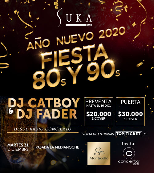 Concursos Ganadores de una fiesta de año nuevo en Suka Club Concursa por una fiesta de año nuevo en Suka Club. Deja tus datos abajo y estarás participando por experiencias para celebrar año nuevo. Por Iván Rimassa | 12 Dic, 2019. 15:53 hrs Concurso Cerrado La mejor fiesta de año nuevo te espera en Suka Club y Concierto te invita a pasarlo bien junto a nuestros DJs Fader y Catboy. Estamos sorteando: Experiencias Vip Sun Monticello para parejas, cena de gala incluida en restoranes Monticello. Entradas VIP y entradas generales a fiesta Suka Club (con distinto tipo de cover). Deja tus datos y participa para que el 2020 te pille con una sonrisa. Ganaron: Experiencia Vip Sun Monticello: Brenda Duarte San Martín Bárbara Berenice Santander Zuñiga Leonardo Esteban Mora Rodriguez Entradas normales Suka Club Patricia Villarroel Medina Mauricio Arias Castillo Cecilia Andrea Torres Torres Entradas VIP Suka Club Ignacio Ortiz Flores Joscelyn Marsh Adrián Riquelme Vieyra María Soledad Velásquez Urrutia Rodrigo Donoso Oyarzun Joao Marques Loyola Alejandra Silva Pizarro Adolfo Camps Judith Gatica Cárdenas Lissette Barrientos Araya concursos Acusación contra Piñera fracasa en cámara de diputados y no continuará "Avengers: Endgame" sería la peor película de la década Sigue a Concierto.cl en Google Discover Recibe nuestros contenidos directamente en tu feed. Seguir en Google Contenido patrocinado