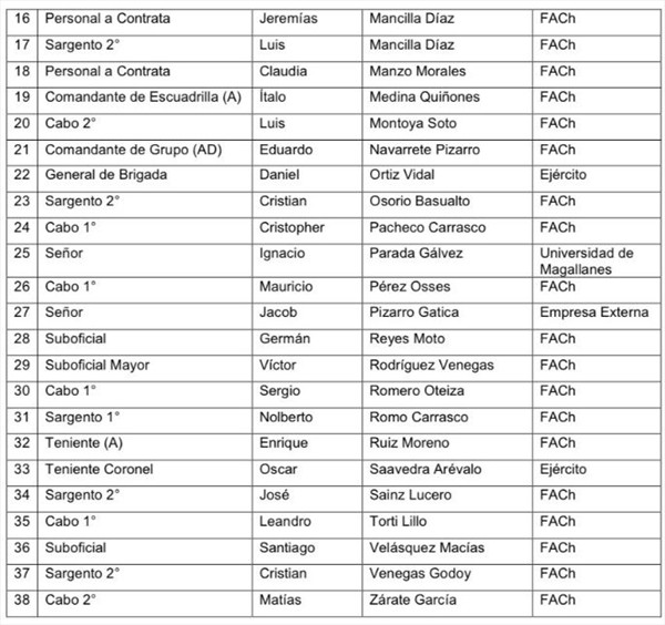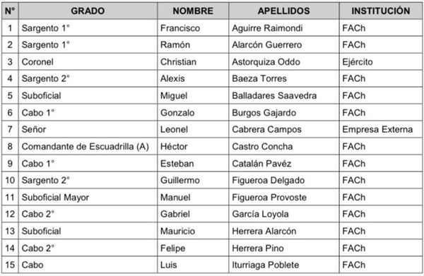 Noticias Sigue búsqueda de avión de la FACh: Entregan lista de pasajeros Al avión C-130 Hércules de la Fuerza Aérea de Chile (FACh) se le perdió el rastro el lunes 9 de diciembre a eso de las 18:00 horas. Por Iván Rimassa | 10 Dic, 2019. 10:16 hrs La Fuerza Aérea de Chile publicó la lista de los 17 tripulantes y 21 pasajeros que viajaban en el Hércules C-130 siniestrado durante el lunes, cuando viajaba a la Antártica. Además, informó que se intensificó la búsqueda de la nave con el apoyo de dos buques mercantes, dos buques de la Armada, aviones de la FACh, de la Armada, de las fuerzas aéreas de Uruguay y Argentina, además de imágenes satelitales proporcionadas por Estados Unidos. Podría interesarte: Chileno interviene en COP25 para hablarle a Greta Thunberg. Actualidad Sebastián Piñera no viajará al cambio de mando en Argentina Piñera anuncia cárcel para algunos delitos de colusión Sigue a Concierto.cl en Google Discover Recibe nuestros contenidos directamente en tu feed. Seguir en Google Contenido patrocinado