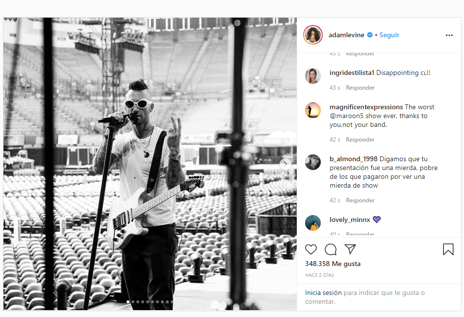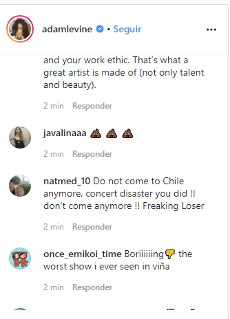 En respuesta a esto, un grupo de chilenos bombardeó la sección de comentarios de la banda y de Adam Levine, escribiéndole con enojo por su, en su opinión, mediocre presentación. La imagen ni siquiera es de su presentación en Chile, sino que son de sus presentaciones en México.