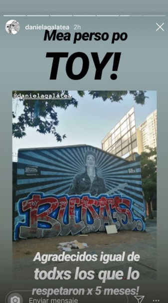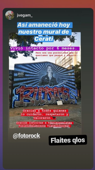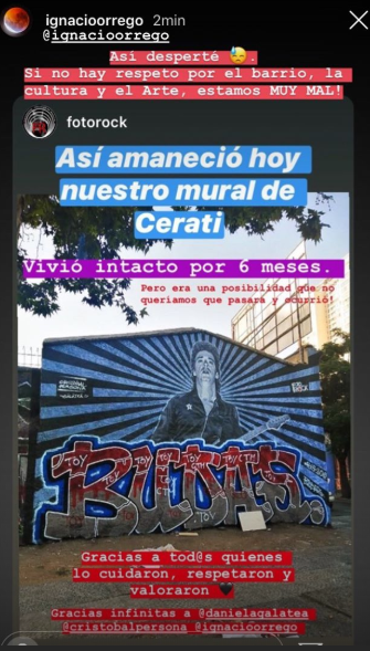 Noticias Rayan mural de Gustavo Cerati en Santiago Centro El mural inaugurado hace cinco meses en la exposición urbana Íconos A Cielo Abierto de Fotorock fue graffiteado por desconocidos. Por Bruno Morales | 04 Feb, 2020. 11:37 hrs En agosto fue inaugurado el mural en homenaje al músico argentino Gustavo Cerati. En la esquina de Roberto Espinoza con Santa Isabel se podía ver la pintura titulada 'Fuerza Natural'. La obra fue graffiteada por desconocidos, rayando la mitad baja del mural. La obra que retrata al líder de Soda Stereo segunda obra perteneciente a la iniciativa 'Íconos a cielo abierto', realizada bajo el margen de la celebración de los 17 años de 'Foto Rock', la cual siempre causó una buena recepción por parte de los fanáticos. Lee también: Mural de Gustavo Cerati se suma a los Íconos A Cielo Abierto Hace poco, los vecinos del lugar que se sitúa frente al Parque Almagro, denunciaron que el mural había sido intervenido y se manifestaron a través de redes sociales. Mira las imágenes a continuación del rayado. Gustavo Cerati Música ¿Animalista?: Marlen Olivari salvó a un pelícano herido en una playa de Reñaca Hugo Caneo, académico de economía U de Chile: “hoy no es momento” de avanzar en proyecto de 40 horas Sigue a Concierto.cl en Google Discover Recibe nuestros contenidos directamente en tu feed. Seguir en Google Contenido patrocinado