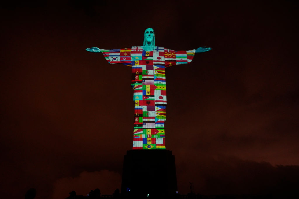 Las banderas de los 166 países afectados con casos de coronavirus fueron proyectadas este miércoles en el Cristo Redentor de Rio de Janeiro.