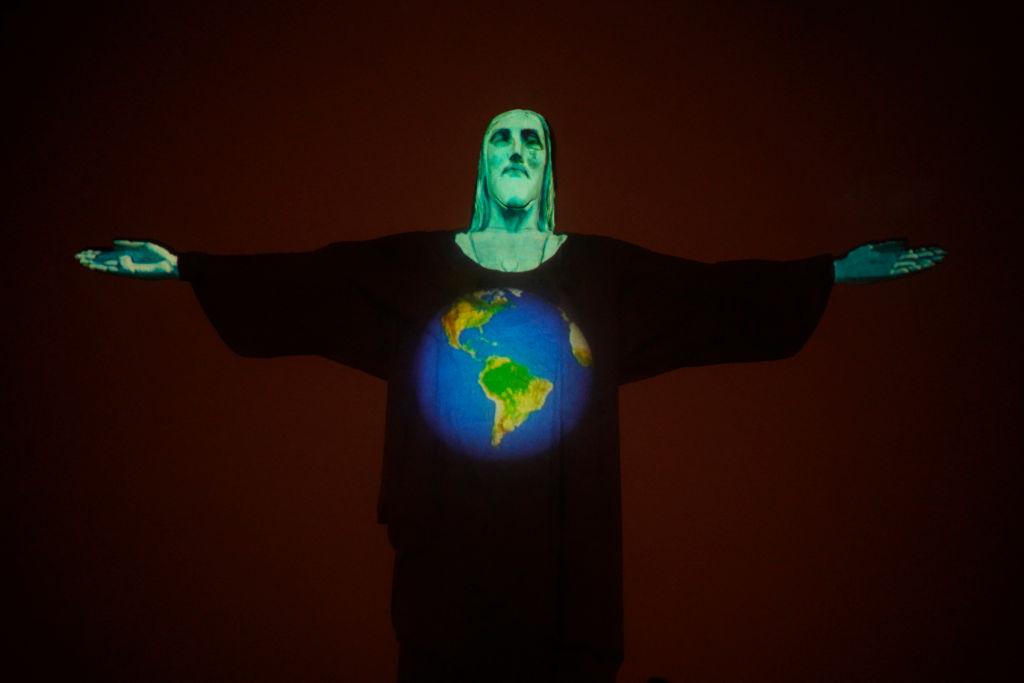 RIO DE JANEIRO, BRAZIL - MARCH 18: The illuminated statue of Christ the Redeemer as Archbishop of the city of Rio de Janeiro, Dom Orani Tempesta, performs a mass in honor of the victims of COVID-19 around the world in Rio de Janeiro, on March 18, 2020 in Rio de Janeiro, Brazil. (Photo by Wagner Meier/Getty Images)
