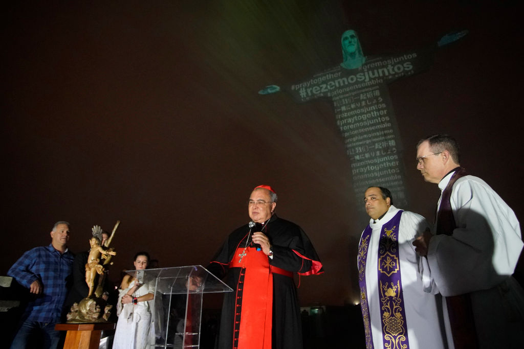 RIO DE JANEIRO, BRAZIL - MARCH 18: Archbishop of the city of Rio de Janeiro, Dom Orani Tempesta, performs a mass in honor of the victims of COVID-19 around the world at the illuminated statue of Christ the Redeemer in Rio de Janeiro, on March 18, 2020 in Rio de Janeiro, Brazil. (Photo by Wagner Meier/Getty Images)