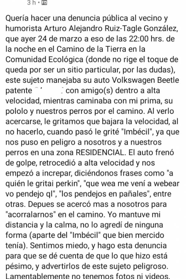 Según se detalla en el post, Ruiz Tagle habría conducido supuestamente a exceso de velocidad por medio de la “comunidad ecológica” de Peñalolén. En ese momento, fue increpado por unos jóvenes.