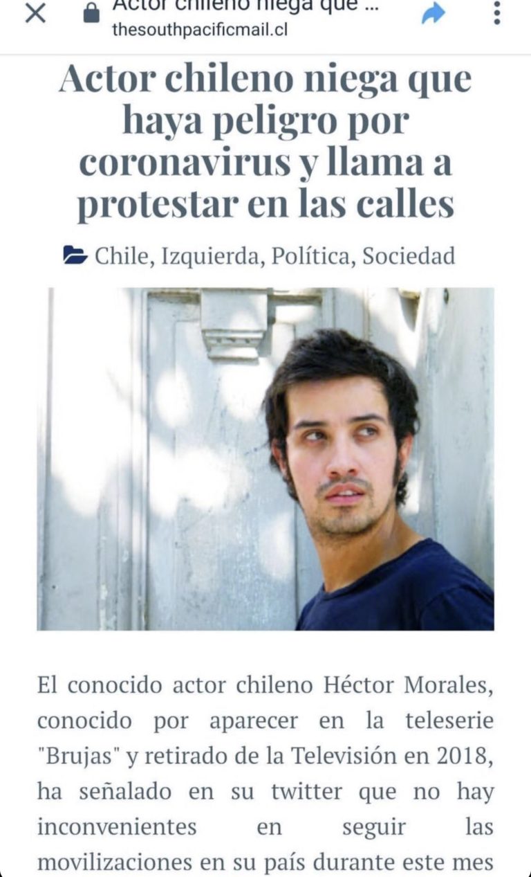 "Actor chileno niega que haya peligro por coronavirus y llama a protestar a las calles", decía el titular de una página llamada "The South Pacific Mail", que ahora se encuentra caída.