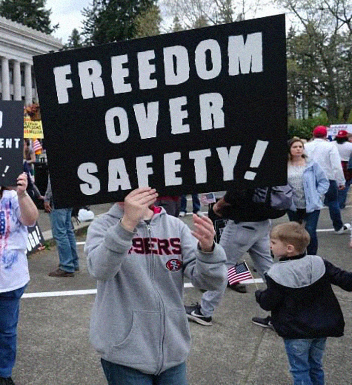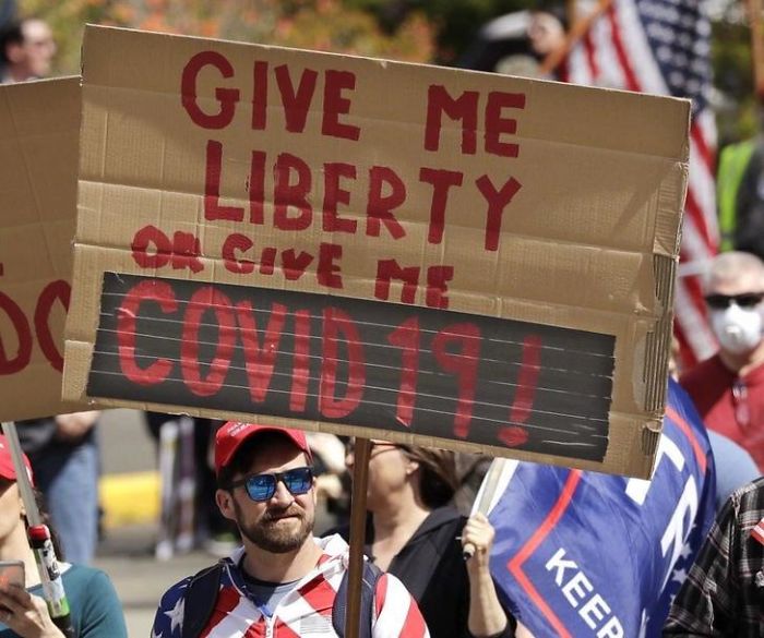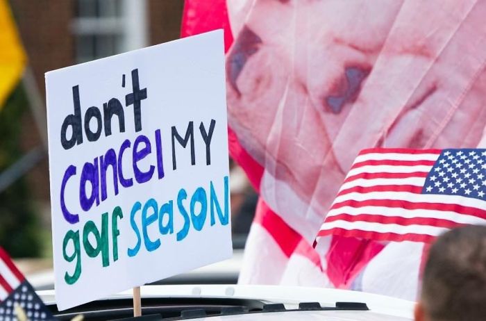 También se podían encontrar otros letreros con consignas más insólitas como “Queremos cortes de pelo”, “No cancelen la temporada de golf” y “Libertad sobre seguridad”.