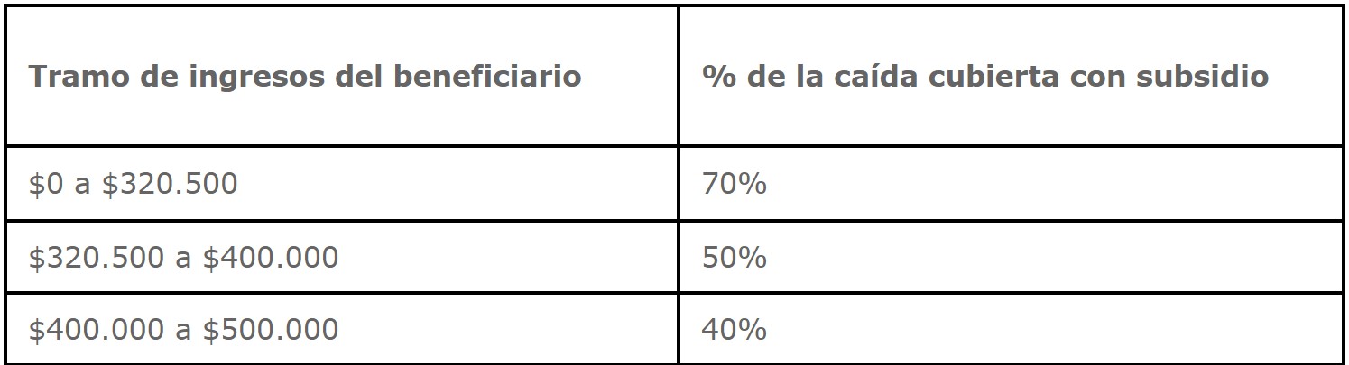 - Para aquellos trabajadores con una renta promedio mensual mayor a $400 mil y menor o igual a $500 mil, se les cubrirá un 40% de la caída. En todos estos casos, el tope del subsidio será $100.000 mensuales.