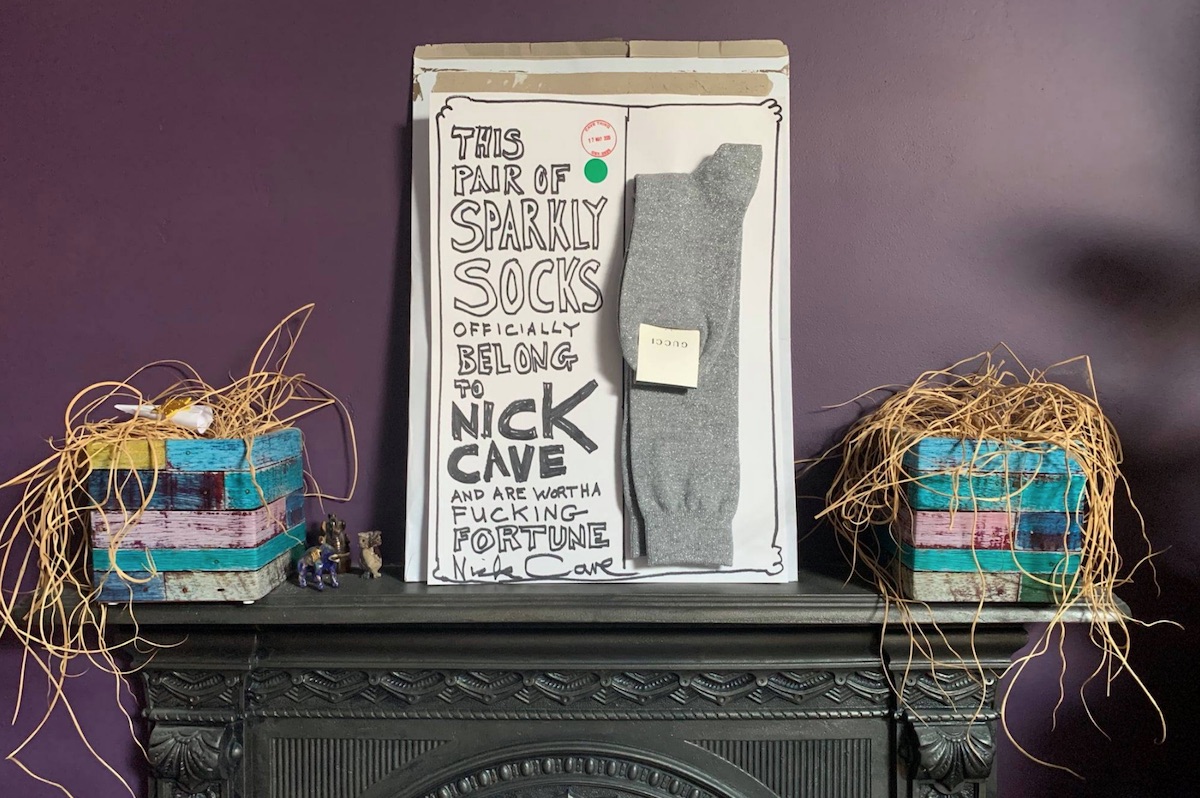 Debido a que Perdue es un "geek de Nick Cave" que viaja por el mundo para ver los espectáculos de la legendaria estrella de rock, un par de sus amigos contactaron en secreto a Cave para ver si estaría interesado en participar. Cave respondió de inmediato, donando un par de calcetines Gucci plateados, brillantes y sin usar, y una pieza de arte dibujada a mano que dice: "Este par de calcetines brillantes pertenecen oficialmente a Nick Cave y valen una maldita fortuna".