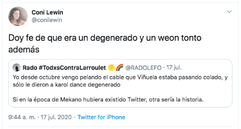 Sin embargo, ahora han salido nuevos testimonios en contra del conductor, entre ellos, Constanza Lewin, integrante de Supernova. A través de Twitter la artista reetwitteó un comentario que señala que Viñuela estaba "pasando Colado" mientras 'funaban' a su compañero Karol Lucero. Sobre esto, la artista comentó: "Doy fe de que era un degenerado y un weon tonto además".