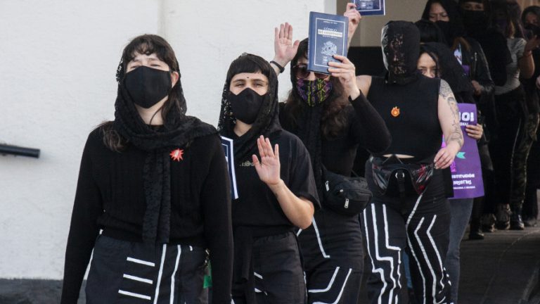 El colectivo feminista LasTesis realizó una performance en Valparaíso, junto decenas de mujeres que terminó mandando a la actual Constitución al mar.