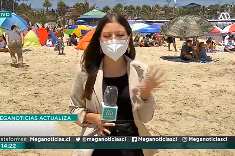 La periodista Bárbara Mena, de Mega, se encontraba contando cómo se enfrentan los contagios por Covid-19 en la zona: “El Litoral Central está completamente en alerta”, fue lo que dijo la profesional cuando, de pronto, desde el extremo izquierdo de la pantalla apareció un veraneante, que se puso de espalda, se bajó los pantalones frente a la cámara e hizo un 'cara pálida', sacando risas entre las otras personas que se encontraban disfrutando de la playa.