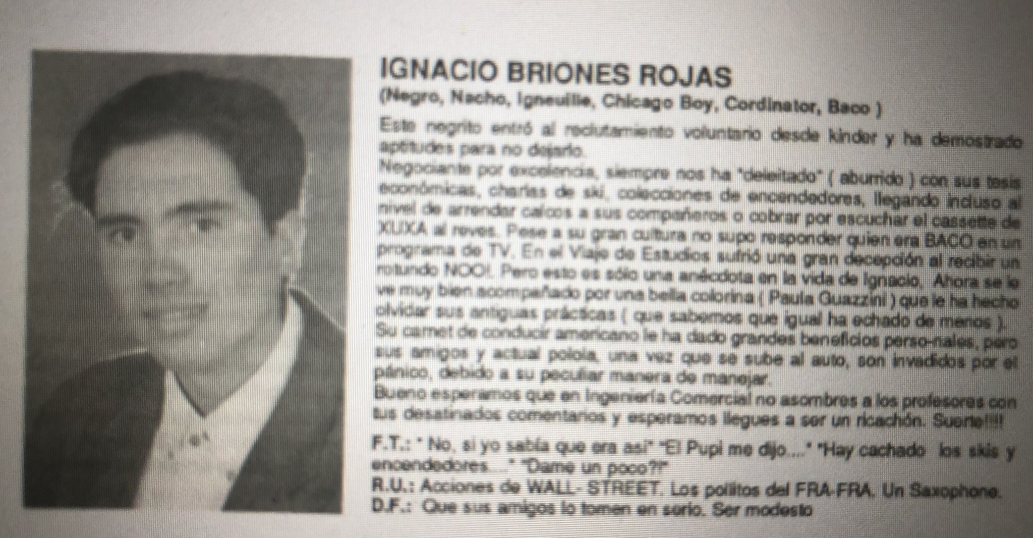 Y por medio del anuario colegial de los dos ingenieros se puede ver que desde adolescentes ya apostaban por tener un cargo importante. Así por lo menos se puede leer en la descripción que realizaron los compañeros de curso de Ignacio Briones, quienes también lo apodaban "Chicago Boy".